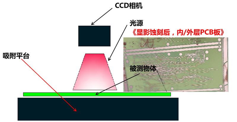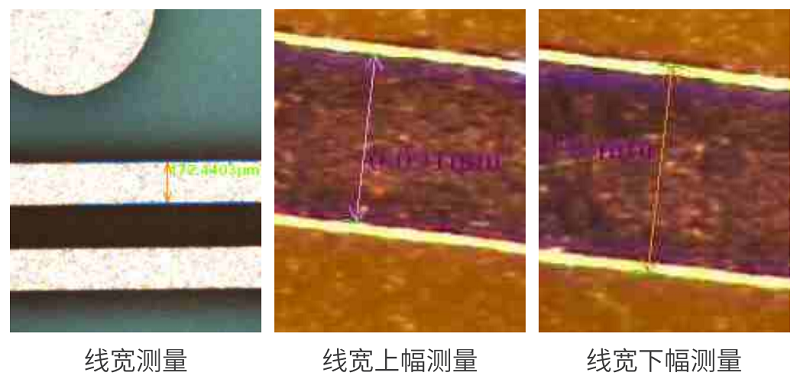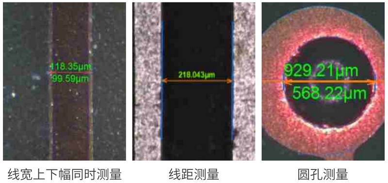 通過影像成像系統及光源從上表面垂直于被測板,呈顯影像(相機實時拍圖)感測,并將圖像傳送至電腦測量軟件,通過軟件測量工具分析圖像的“線寬/線距/線寬上下幅//金手指線寬等”標準公差值對比,從而判斷被測板上的測量值OKNG