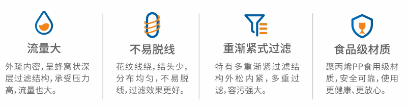 PP濾芯選用100%全新聚丙烯(PP)高分子材料,采用雙機雙模頭全自動化生產(chǎn)設備制造而成,產(chǎn)品外疏內(nèi)密,深層過濾,過濾效果好,使用壽命長。