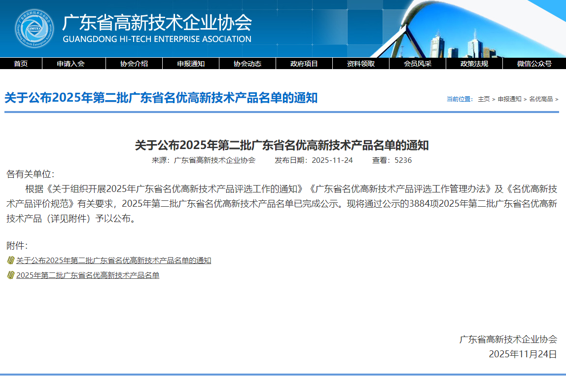 “廣東省名優高新技術產品”是廣東省科學技術廳、廣東省高新技術企業協會為促進科技創新與技術攻關,推動關鍵核心技術創新能力提升,引導企業以高質量科技供給助推高質量發展而設立的省級產品榮譽。評選著重考察產品的技術領先性與市場競爭力,獲評產品通常具備國內首創、可替代進口、達到國內國際先進水平等特點,是企業核心實力的重要體現。