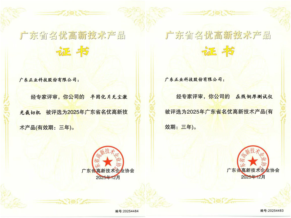 近日,廣東省高新技術企業協會正式公布了2025年第二批廣東省名優高新技術產品評選結果。廣東正業科技股份有限公司憑借自主研發的“半固化片無塵激光裁切機”和“在線銅厚測試儀”兩款高性能設備,成功入選“廣東省名優高新技術產品”名單,彰顯了公司在高新技術產品研發與制造領域的實力。