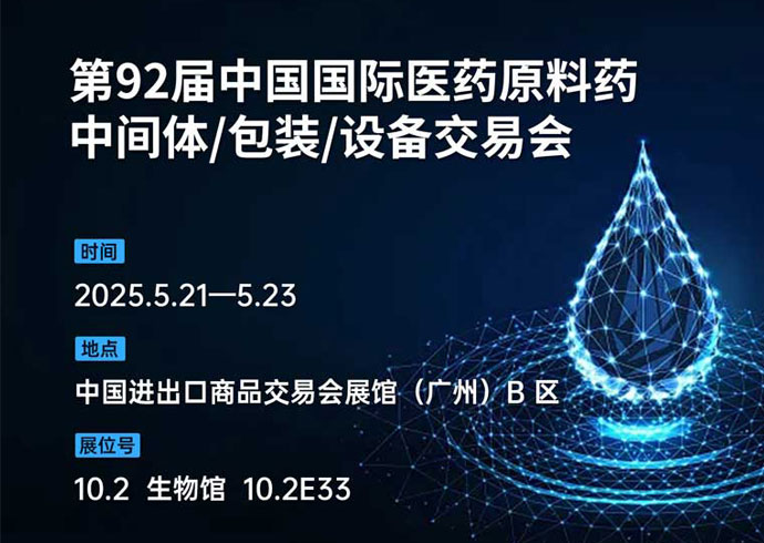 第92屆中國國際醫藥原料藥/中間體/包裝/設備交易會 時間:2025.5.21-5.23 地點:中國進出口商品交易會展館:(廣州)B區 展位號:10.2 生物館 10.2E33