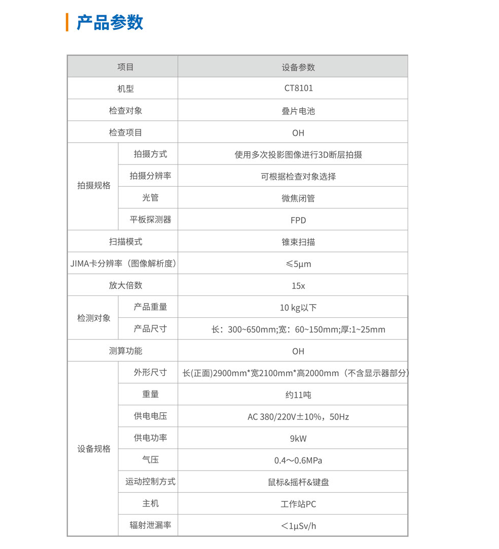 利用X射線的透視能力,從不同角度對電芯角位進行透射,并在平板探測器上成像,拍攝一系列不同角度的二維透視圖像,再通過三維重構軟件合成為高分辨率三維圖像數據,即可在任意位置、任意方向進行虛擬剖切觀測,然后結合智能化軟件算法在圖像上對電芯的OH進行分析判斷,主要用于新能源行業的動力疊片電池的OH檢測與質量控制。